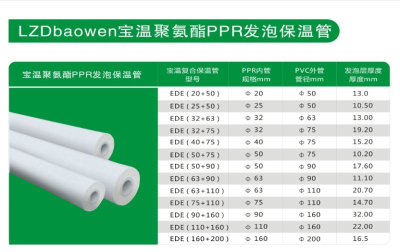 PPR聚氨酯發(fā)泡保溫管為當下熱水工程目前采用的一種新型環(huán)保,節(jié)能,自帶保溫層熱水管一體式保溫管,它具有外形美觀、安裝連接方便、保溫效果好、健康環(huán)保等特點。PPR聚氨酯發(fā)泡保溫管的內(nèi)芯管采用PPR2.0Mpa熱水管,保證過熱水管道質量穩(wěn)定;外管采用PVC硬管,具有抗沖擊,抗壓,保證管材在運輸、安裝和使用過程中免受破壞;中間層是采用進口聚氨酯成型的保溫層,保溫層緊密粘附內(nèi)外管并充分填滿之間空隙,使管道、外套及保溫層三者形成一個牢固的整體,保溫效果好,聚氨酯發(fā)泡保溫層的厚度也可根據(jù)客戶要求定制。